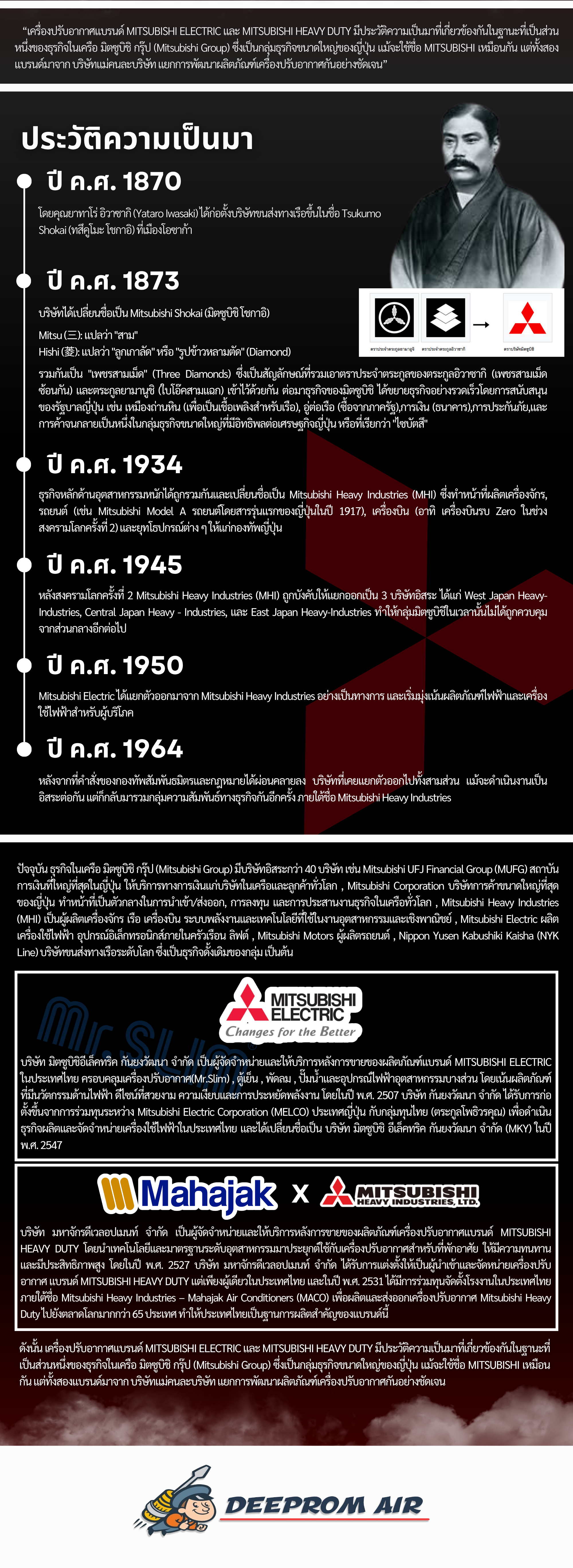 “เครื่องปรับอากาศแบรนด์ MITSUBISHI ELECTRIC และ MITSUBISHI HEAVY DUTY มีประวัติความเป็นมาที่เกี่ยวข้องกันในฐานะที่เป็นส่วนหนึ่งของธุรกิจในเครือ มิตซูบิชิ กรุ๊ป (Mitsubishi Group) ซึ่งเป็นกลุ่มธุรกิจขนาดใหญ่ของญี่ปุ่น แม้จะใช้ชื่อ MITSUBISHI เหมือนกัน แต่ทั้งสองแบรนด์มาจาก บริษัทแม่คนละบริษัท แยกการพัฒนาผลิตภัณฑ์เครื่องปรับอากาศกันอย่างชัดเจน”